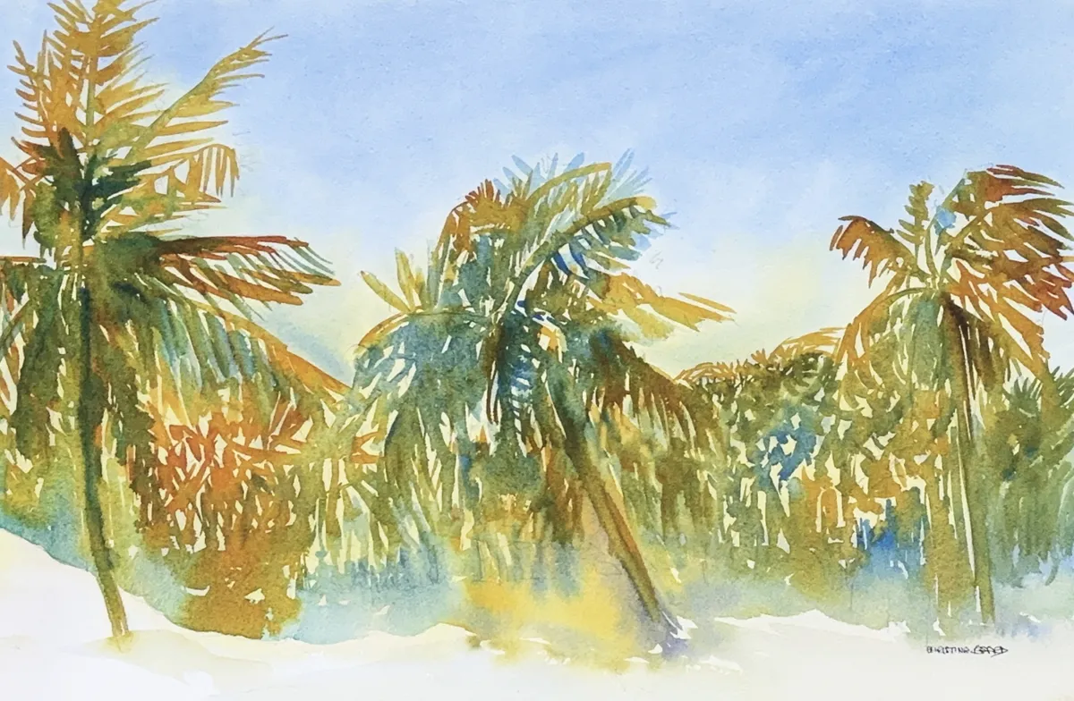 Shoreline Palm Tree Fringe By Christine Beard 2025 Watercolour On Paper 41 cm W x 31 cm H.jpg