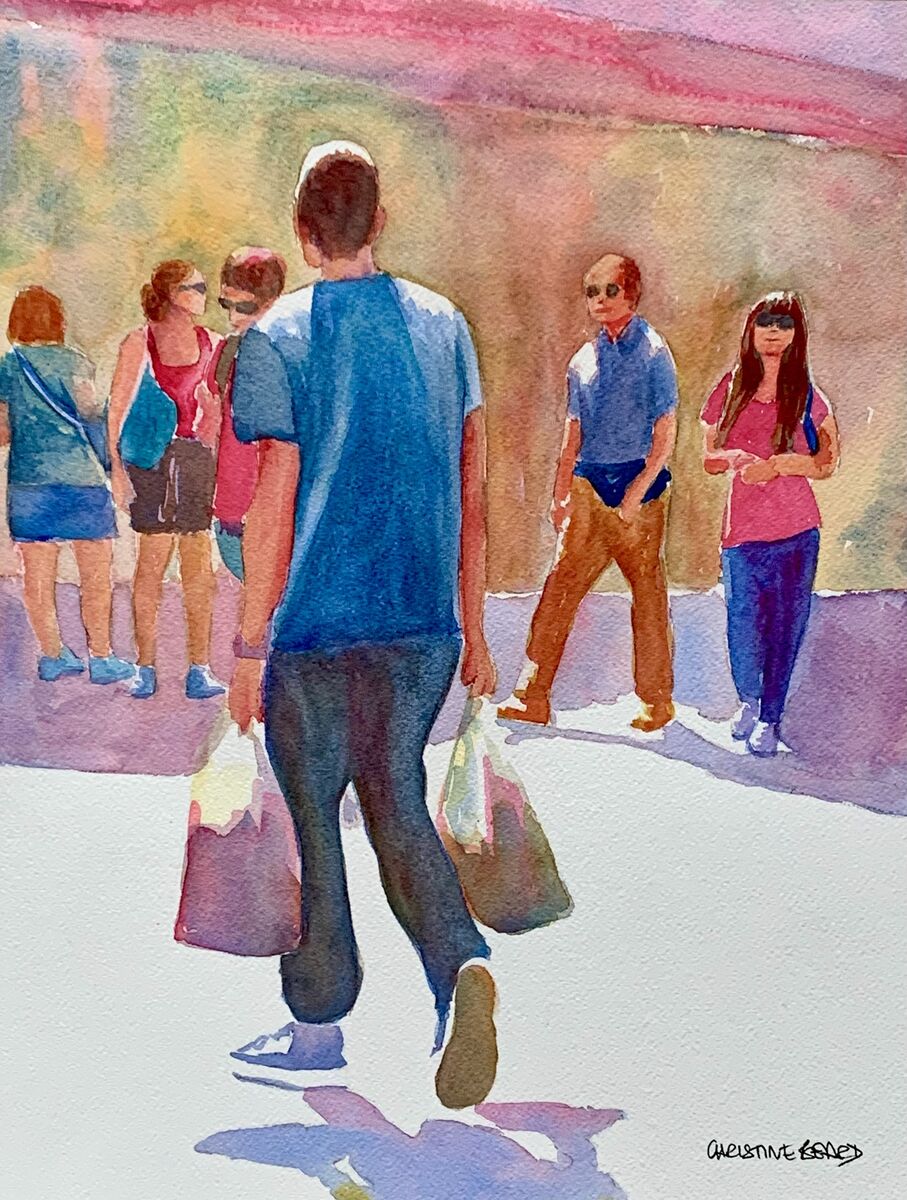 Urban Commotion. A Bustling Shopping District Christine Beard 2023 Watercolour On Paper 31 cm W x 41 cm H