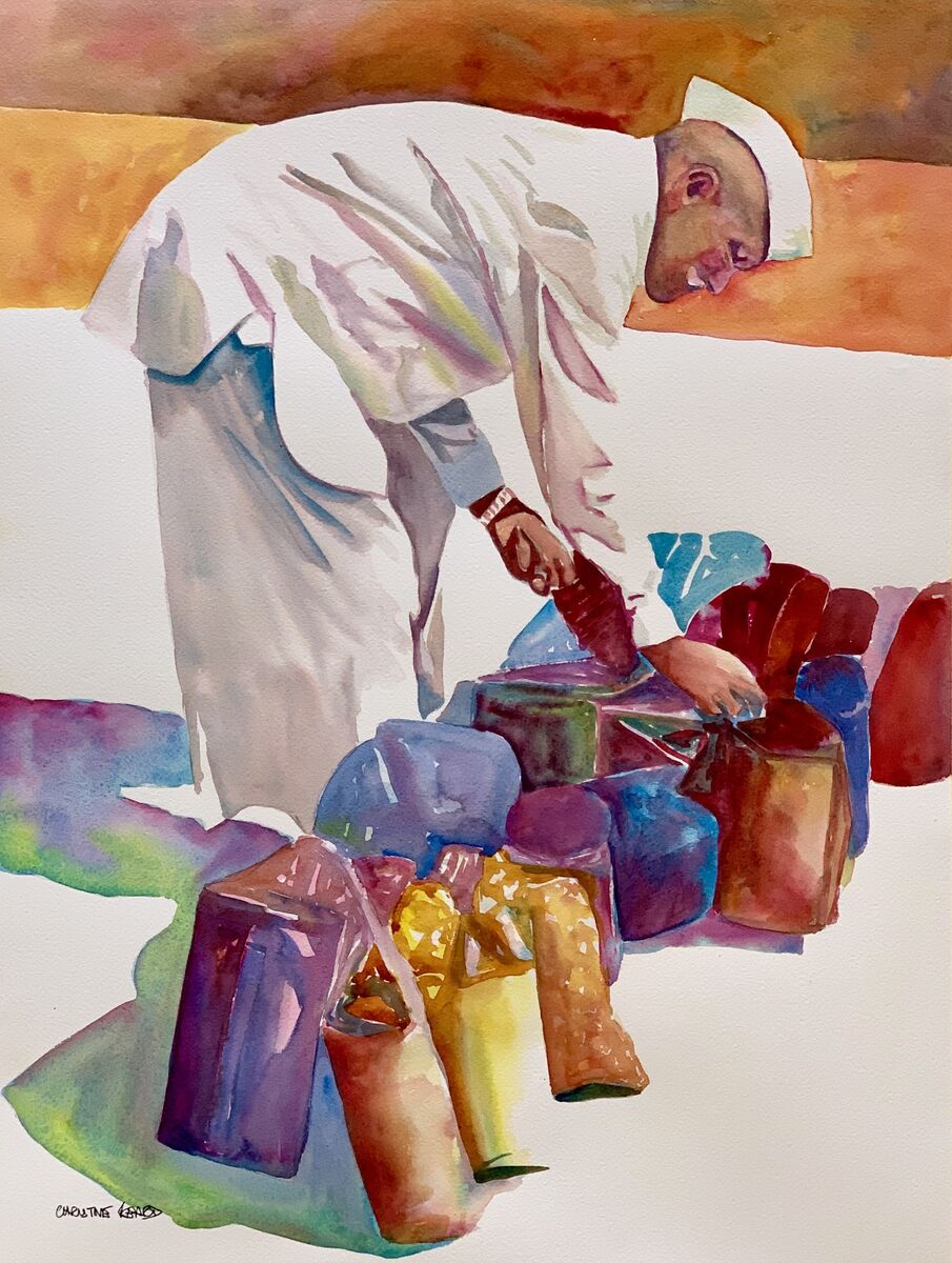 Curator Of Bags By Christine Beard 2023 Watercolour On Paper 46 cm W x 61 cm H