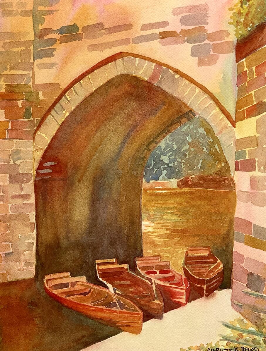 Docked Under The Archway By Christine Beard 2023 Watercolour On Paper 31 cm W x 41 cm H